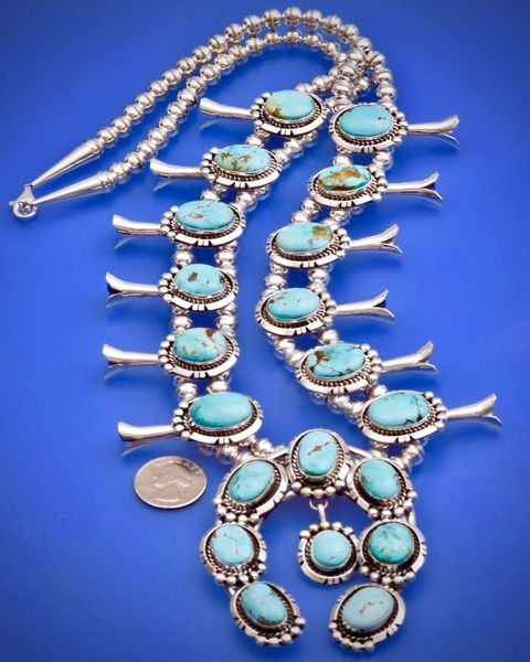 Squash blossom necklace designs at 50 off with free shipping here at SilverTribe. Really the best way to find value is to send or take the item to a person experienced and knowledgeable about Native American jewelry. Lots of silver in the quarter size settings and the turquoise is veined so beautifully.